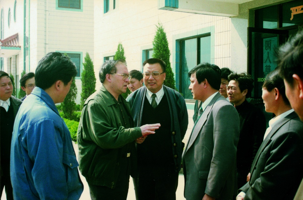 原國家人事部副部長、時任浙江省省長萬學遠(左二)等領導在浙江宏達經(jīng)編股份有限公司指導工作