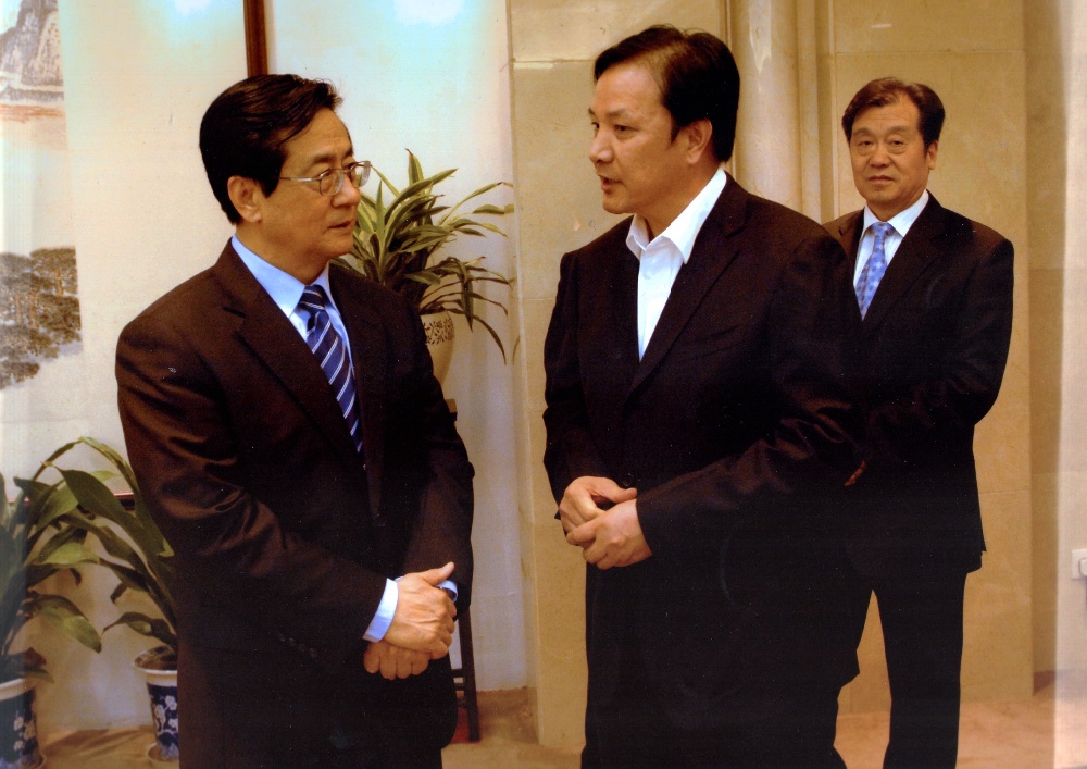 中央書記處書紀(時任中共浙江省委書記)趙洪祝在接見浙江省十位企業家時與沈國甫總經理交談