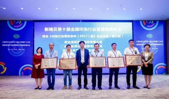 2021年5月19日, 第十屆全國印染行業(yè)管理創(chuàng)新年會在四川省樂山市舉行。本屆創(chuàng)新年會以 “精益重塑價值,智造賦能轉(zhuǎn)型”為主題,圍繞精益生產(chǎn)、智能制造、質(zhì)量管理、化學(xué)品管控等議題開展交流。會上對符合《印染行業(yè)規(guī)范條件(2017版)》企業(yè)名單(第三批)進行了表彰,宏達高科副總經(jīng)理孫云浩代表公司上臺領(lǐng)獎。