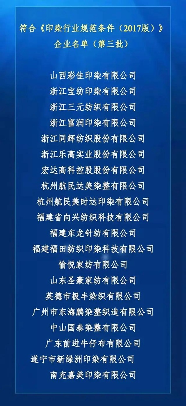 據(jù)了解,符合《印染行業(yè)規(guī)范條件(2017版)》企業(yè)現(xiàn)全國共通過三批42家,公司歷經(jīng)2年的申請、資料評審及現(xiàn)場評審,于今年被列入“第三批印染行業(yè)規(guī)范公告企業(yè)”名單。