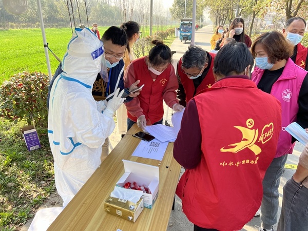 織造支部黨員沈海燕,連續6天早點6點到11點,在許橋村群義組核酸檢測點,協助村民登記信息,檢查健康碼。
