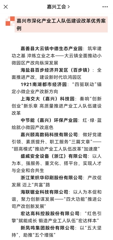 據了解,本次案例評選是嘉興市全面啟動新時代產業工人隊伍建設改革以來,各地各單位結合產業、行業、企業特點和區域特色,聚焦聚力非公企業和小微企業園區,積極開展探索創新實踐,全面協調推進全市產改工作實現了點向面轉換、表及里深化的良好態勢,培育形成了一批不同類型、有示范帶動作用、經驗可復制可推廣的工作樣板和優秀案例。經嘉興市市產改協調小組辦公室認真評審,研究確定了嘉興市深化非公企業產業工人隊伍建設改革十大工作舉措、嘉興市鎮街(園區)深化非公企業產業工人隊伍建設改革十大樣板、嘉興市非公企業產業工人隊伍建設改革助力共同富裕典范城市建設十大案例和17個優秀案例。