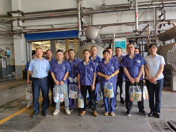 在“宏達高科”溫度最高的染整定型、染整染色車間,公司管理人員向堅守崗位的一線員工表示親切的慰問和感謝,為他們送上毛巾、沐浴露等清涼用品,囑咐大家高溫生產不忘安全,做到勞逸結合,并要求各部門切實做好防暑降溫工作,保障員工健康安全。