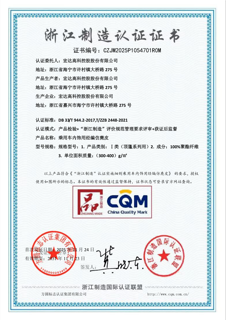 近日,宏達高科自主研發的“乘用車內飾用經編仿麂皮”產品順利通過“浙江制造”認證,榮獲《浙江制造認證證書》(證書編號:CZJM2025P1054701ROM)。該認證依據DB 33/T 944.2-2017、T/ZZB 2448-2021標準嚴格審核,標志著我司產品在品質穩定性、技術創新性及環保安全性等方面均達到“浙江制造”高標準要求。