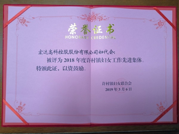 2019年3月6日下午,許村鎮(zhèn)在龍渡學(xué)堂舉行紀(jì)念“三八”國際婦女節(jié)109周年表彰大會暨基層?jì)D聯(lián)“五項(xiàng)全能”擂臺賽啟動儀式。會上,許村鎮(zhèn)對2018年度十佳優(yōu)美庭院示范戶、十佳最美家庭、優(yōu)秀村(社區(qū))婦女組長、婦女工作先進(jìn)集體和先進(jìn)個人進(jìn)行了表彰,宏達(dá)高科控股股份有限公司婦代會被評為“2018年度許村鎮(zhèn)婦女工作先進(jìn)集體”。