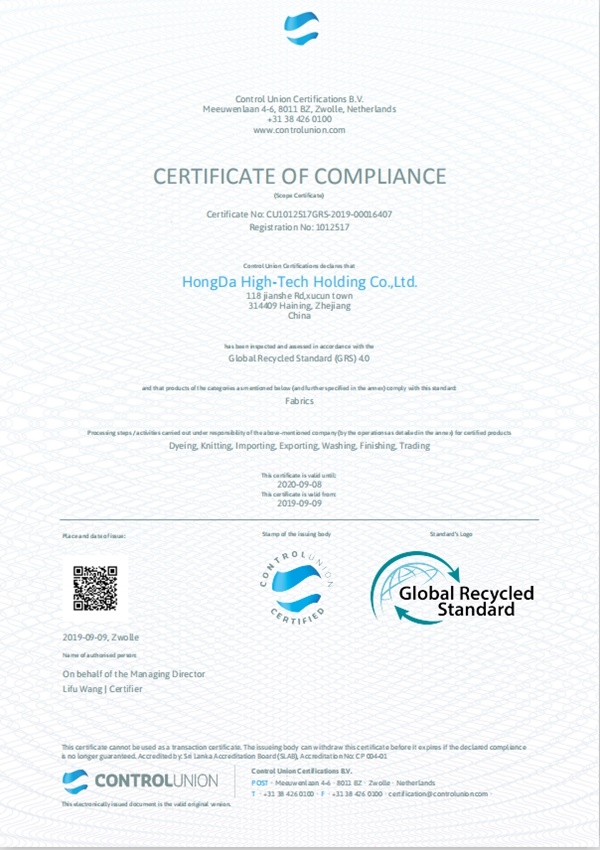 GRS認證的通過,將有助于“宏達高科”提升“綠色”和“環保”品牌形象,提高全球采購商的認可度,從而為更多的產品走向國際市場奠定基礎。