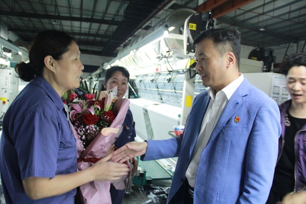 在宏達(dá)高科,朱書(shū)記來(lái)到經(jīng)編車(chē)間,慰問(wèn)了全國(guó)勞動(dòng)模范何娟鳳、嘉興市、海寧市勞動(dòng)模范趙巧娟。何娟鳳和趙巧娟都是宏達(dá)高科的普通一線(xiàn)員工。十幾年來(lái),她們?cè)趰徫簧锨谇趹⒖嗑毤寄堋F渲汹w巧娟曾被評(píng)為全國(guó)紡織工業(yè)技術(shù)能手,也是嘉興市最美職工。朱書(shū)記說(shuō),這樣的榮譽(yù)來(lái)之不易,并勉勵(lì)她們?cè)趰徫焕^續(xù)努力,進(jìn)一步弘揚(yáng)工匠精神。
