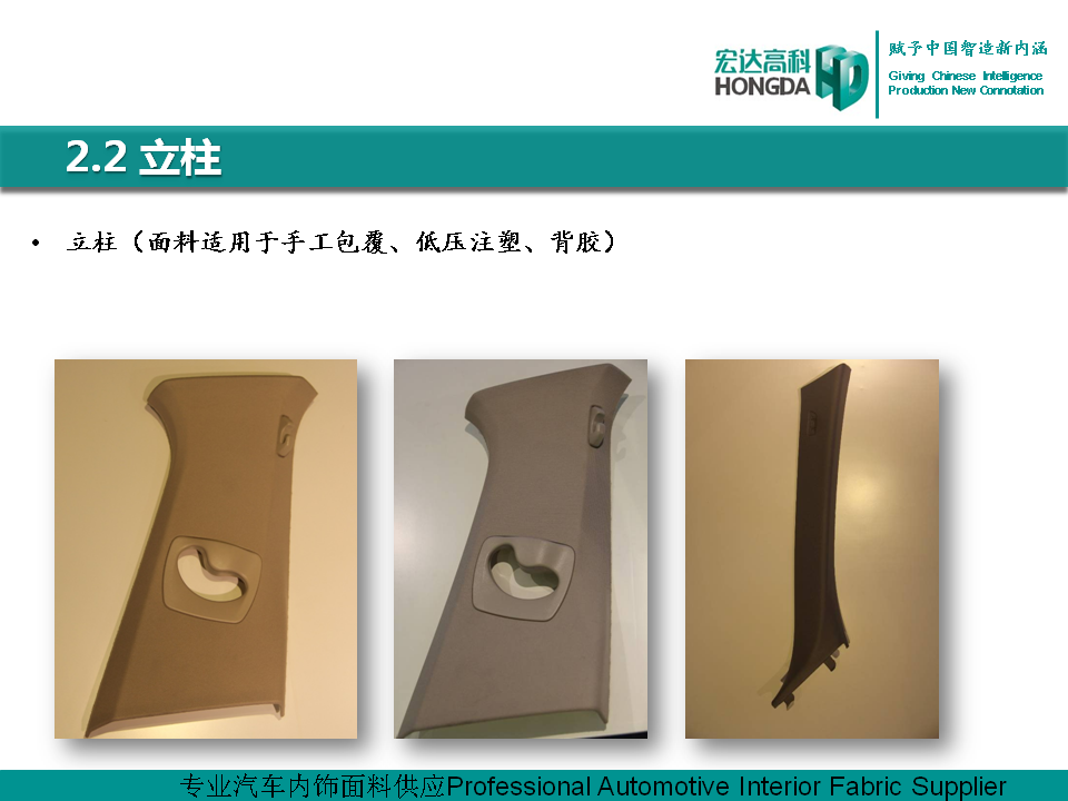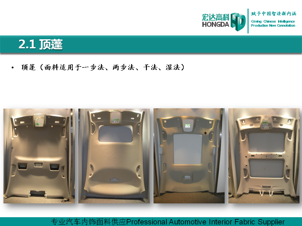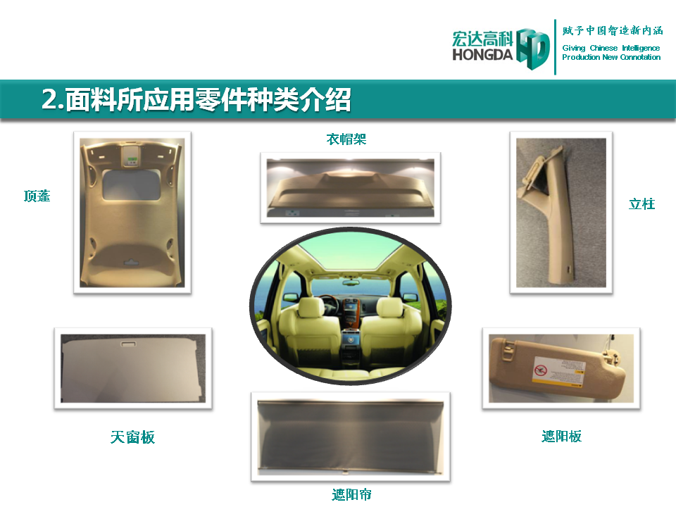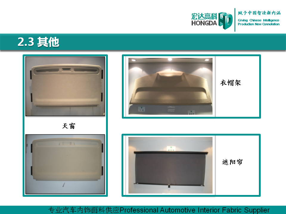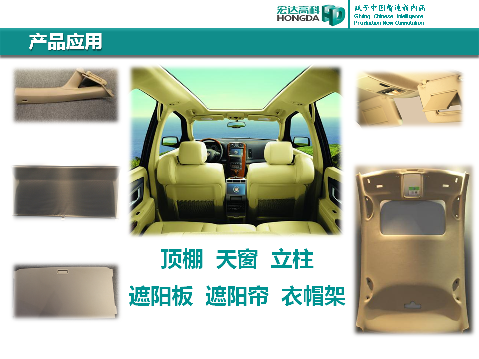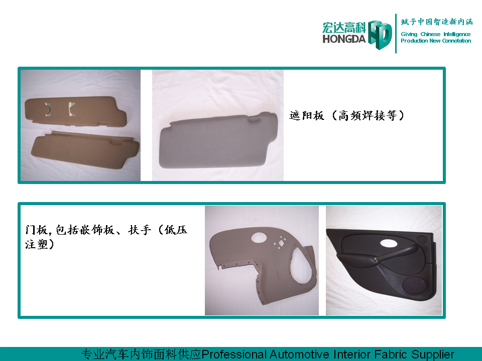 汽車(chē)內(nèi)飾面料是宏達(dá)高科的主導(dǎo)產(chǎn)品,通過(guò)國(guó)家火炬計(jì)劃項(xiàng)目驗(yàn)收,列入國(guó)家重點(diǎn)新產(chǎn)品。產(chǎn)品采用進(jìn)口原料和先進(jìn)的生產(chǎn)工藝,具有防油、防水、防污、吸音、阻燃、耐光照等特性,各項(xiàng)技 術(shù)指標(biāo)性能達(dá)到國(guó)際先進(jìn)水平,現(xiàn)已成為國(guó)內(nèi)十多家大型汽車(chē)制造企業(yè)主要的內(nèi)飾面料供應(yīng)商,并出口美國(guó)、德國(guó)等